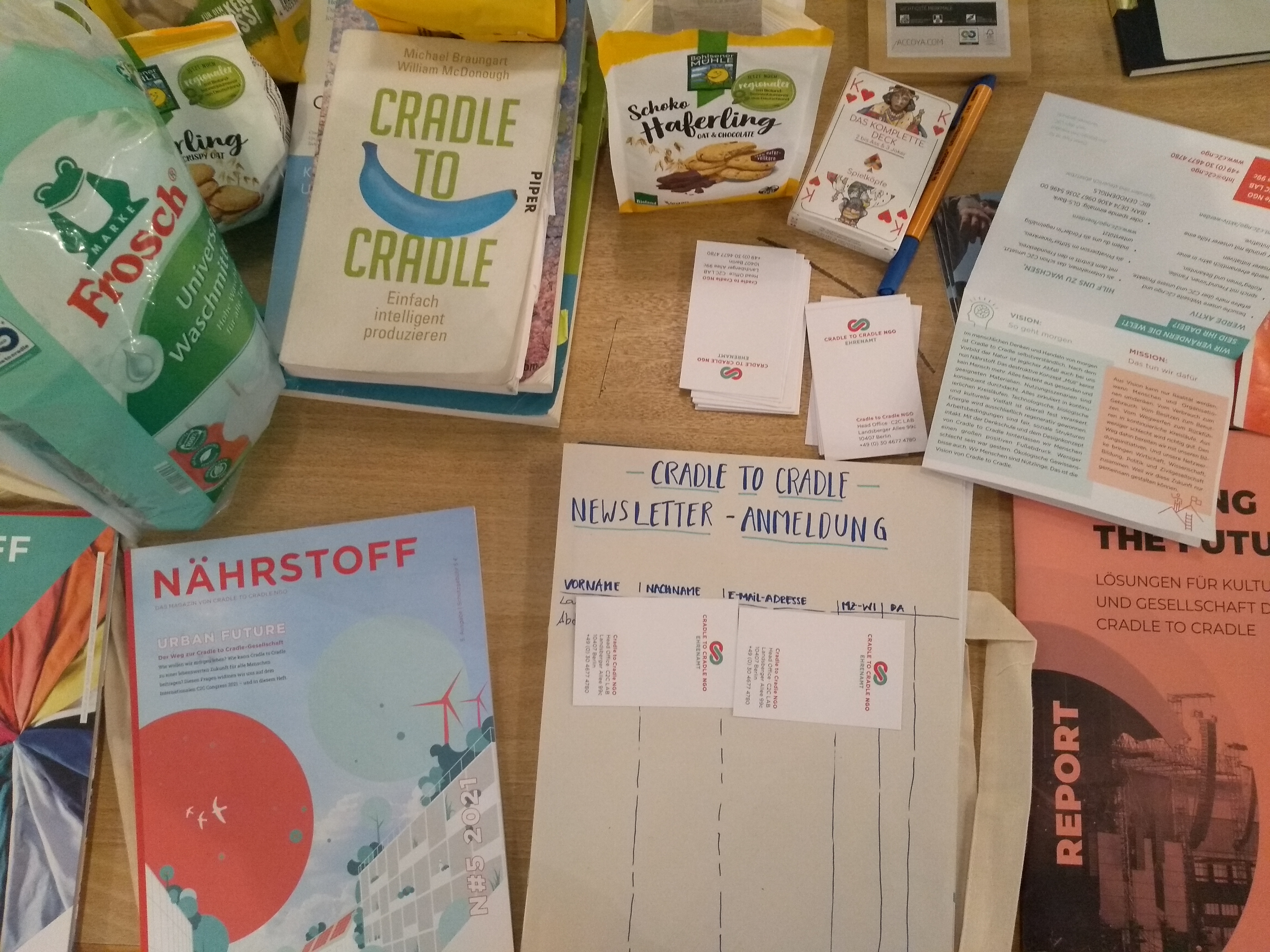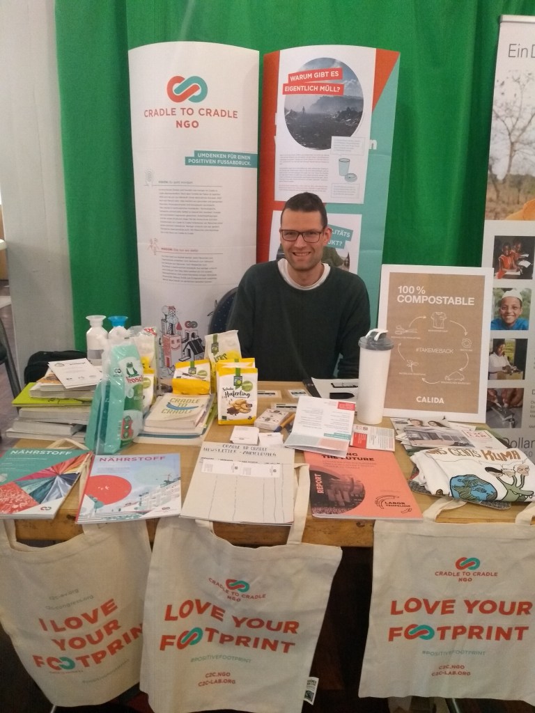Cradle to Cradle NGO (www.c2c.ngo): The organisation with its headquarters in Berlin aims to produce sustainable goods which can be recycled rather than being disposed. Raw materials on Earth are diminishing more and more. If we reuse materials and hold them in closed-loop systems (cradle-to-cradle), we do not produce additional waste and use the nature’s resources responsibly. For instance our clothes often contain polyester which poses a problem because polyester is not compostable, it does not decompose naturally. The system has thus a dead end, the shirt ends as waste. A very interesting insight.